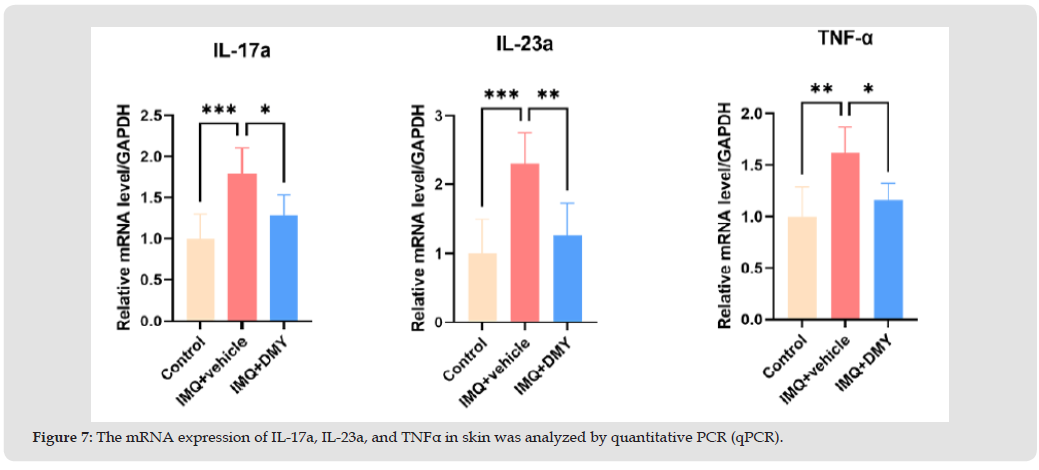 The evidence suggests that inflammatory cytokines, such as tumor necrosis factor-α (TNF-α), interleukin (IL)-17, and interleukin (IL)-23 play a crucial role in the pathophysiology of psoriasis [13,14]. We observed the mRNA expressions of IL-17a, IL-23a, and TNF-α significantly decreased in skin tissues of IMQ+DMY group, compared with the IMQ + vehicle group (Figure 7). DMY effectively reduced skin inflammation.