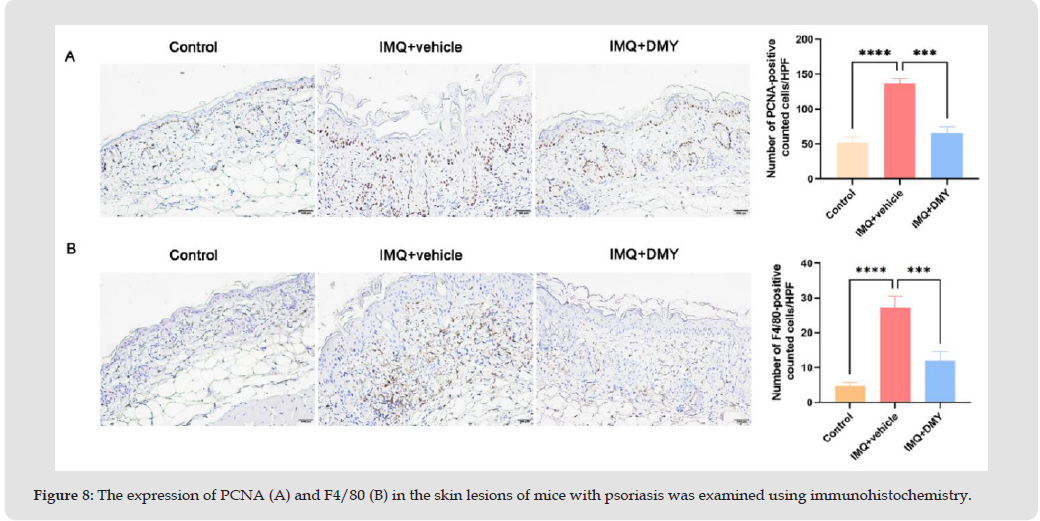 The expression of proliferating cell nuclear antigen (PCNA), an indicator of cell proliferation, is usually observed in the basal layer of the epidermis with lower levels in normal skin. Our study revealed that IMQ treatment significantly increased the number of PCNA -positive cells in psoriatic lesions on mouse epidermis, while topical application of DMY effectively reduced PCNA levels on the trunk skin of IMQ-induced BALB/c mice (Figure 8A). These findings suggest that DMY administration leads to remission of IMQ-induced psoriasis. To assess the impact of DMY on infiltrating macrophages, we examined the levels of F4/80+ macrophages in IMQ-induced mice. We observed a significant increase in F4/80+ macrophage levels in the dermal skin following exposure to IMQ compared to the control group. However, treatment with DMY significantly suppressed the population of F4/80+ macrophages in the skin from IMQ-treated mice when compared to vehicle treatment (Figure 8B).