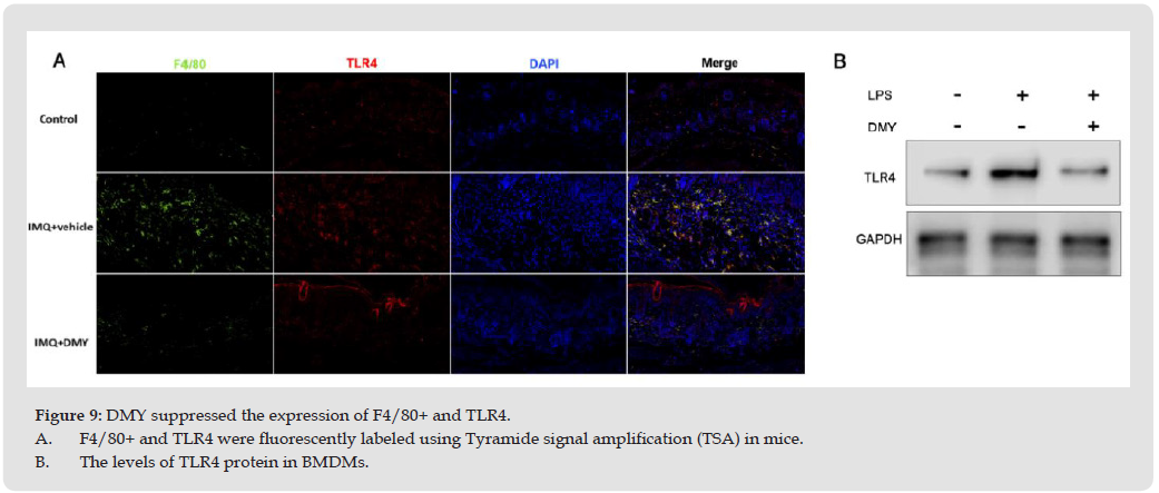 The Toll-like receptors (TLRs) play a pivotal role as essential pattern recognition receptors for immune cells. Immunofluorescence analysis revealed that TLR4 co-localization with F4/80+ macrophages in IMQ- induced psoriasis mouse skin, and a higher degree of co-expression between F4/80 and TLR4 was observed in the psoriasis mouse skin. However, after DMY application, a significant reduction in the co- expression of F4/80 and TLR4 was observed (Figure 9A). The LPS is capable of binding to TLR4, leading to pro-inflammatory response. In this study, we stimulated primary macrophages with LPS and investigated the impact of DMY on TLR4 signaling in these cells. Our findings revealed that LPS significantly upregulated the expression levels of TLR4 protein, whereas treatment with DMY resulted in a significant reduction in TLR4 protein levels compared to the LPS group (Figure 9B).