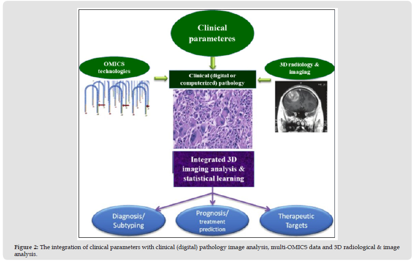 The application of targeted cancer therapies fall under the rubric of predictive biomarkers, which address the potential response or insensitivity of the tumor to a particular therapy. In this case, companion diagnostic tests must be codeveloped with the drug through clinical trials in order to not only demonstrate drug efficacy but also validity of the predictive test. One of the best known examples of a predictive marker is the Her2/neu diagnostic test for treatment of Her2 positive metastatic breast cancer with Herceptin. Clinical pathology consists of a panel of OMICS-guided tests to detect, diagnose and monitor various disease related conditions (Figure 2). The integration of clinical parameters with clinical (digital) digital pathology image analysis, multi-OMICS data and 3D radiological & image analysis can provide a more comprehensive view that can be used for tissue subtyping, assessment of prognosis and predicting response to treatment. Clinical pathology being digitalized, can add an extra layer of information to help visualize in a spatial and microenvironmental context the molecular information of the mechanisms of the disorder. Using advanced digital image analysis, a larger spectrum of parameters can be analyzed as potential predictors of clinical behavior. Correlation between OMICS driven data, morphological features and host immune response can be also performed with therapeutic implications. Molecular imaging or the interface of radiological images and histology is another emerging exciting field which encompasses the integration of the latter with digital pathological images, OMICS and clinical data to portray a more holistic approach to understating and treating disease.