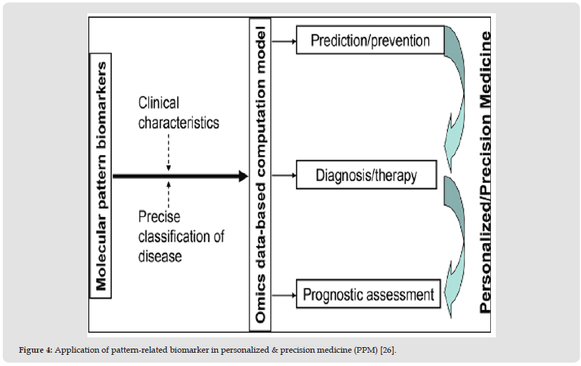 The success in the management of disorders directly depends on the stage of the pathological process, and a wide range of biomarkers, due to their high specificity, can diagnose a disease and/or predict the risks of its development at the preclinical stage with almost 100% probability. A biomarker is a collection of genomic and proteomic signatures used to distinguish between healthy, preillness and diseased individual. These signatures can be in the form of DNA (ssDNA, dsDNA and retrotransposons), RNA (mRNA, miRNA, circRNA and lncRNA) or protein (antibodies and peptides) depending upon the site of secretion and isolation. The success of biomarker-based therapy can be attributed to the development of new sequencing strategies and characterization of tumor pathways with increasing knowledge about druggable targets and its predictive outcome. One of the earliest biomarkers to reach clinical practice was the identification of mutations in KRAS gene in some cancer types, which are predictive of therapeutic response towards anti-epidermal growth factor receptor (EGFR). Meanwhile, marker molecules are used to determine, in particular, the state of cell damage processes, a number of functionally important biomolecules, as well as the presence of metabolites or precursor proteins, which are detected thanks to innovative OMICS- technologies unveiling cellular and molecular mechanism of clinical pathologies (Figures 1A & 1B). PPM adopts a more nuanced strategy taking both genotypic and phenotypic differences into account to create a therapy or preventative method that may be used to benefit both populations and individuals.