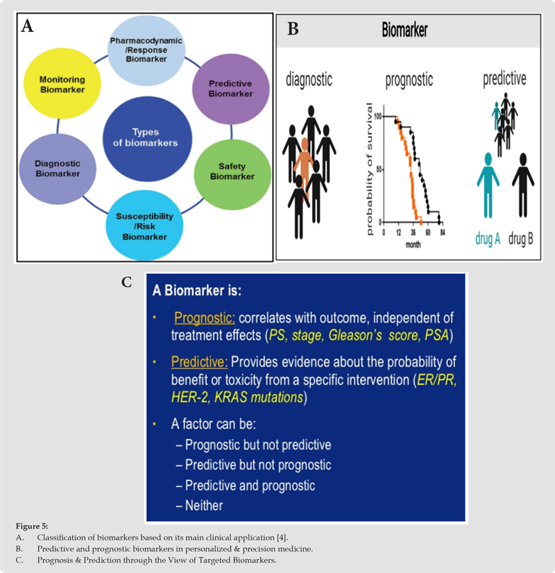 To establish whether a marker is purely prognostic, it needs to be demonstrated that there would be a strong association between biomarkerrelated profile and the outcome, regardless of treatment. The latter can be used in diagnostics, as well as in assessment of disease severity, risk stratification, prediction, guide clinical decisions, and help pick appropriate treatment, modify therapy, and response to it. In a broader strategic sense demonstrating the evidencebased clinical value, there are key categories of biomarkers (Figures 5A-5C), including [5]: Biomarkers are critical to the rational development of medical therapeutics, but significant confusion persists regarding fundamental definitions and concepts involved in their use in clinical practice, particularly in the fields of chronic disease and nutrition. Clarification of the definitions of different biomarkers and a better understanding of their appropriate application could result in substantial benefits. The use of biomarkers as preearly (subclinical) warning systems in the evaluation of disease risk has increased markedly in the last decade. Biomarkers are indicators of typical biological processes, pathogenic processes, or pharmacological reactions to therapy.