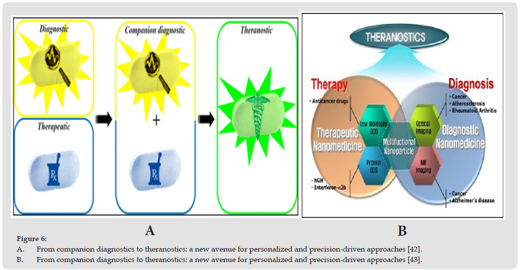 This is particularly true for stratification biomarkers that require a companion diagnostic marker (theranostic) that is codeveloped with a certain drug [9]. Theranostics is considered a fusion of diagnosis and medication. It helps to optimize the rationalization of safety, effective results and overall drug development. The latter in the future of PPM, being and serving as a valuable guidance, would play a crucial role in clinical practice since possessing their accuracy is crucial for the success of the therapeutic, preventive, prophylactic, and rehabilitative choice (Figures 6A & 6B). There is a growing paradigm within the frame of PPM about a shift toward integrating therapeutics and diagnostics rather than developing and deploying them separately. In this gradual move toward more effective and PPM guided medications, companion diagnostics are an intermediate stage.