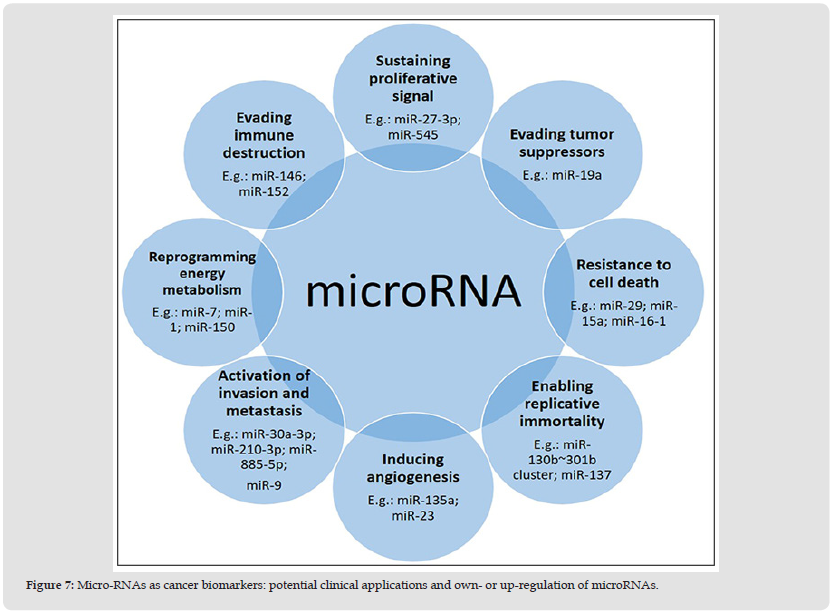 In addition to their biological significance, they are exploited as potential cancer biomarkers. In particular, microRNAs (miRNAs) (see the next Fig), a subclass of small noncoding RNAs that epigenetically modulate gene transcription, have become one of the most well studied substrates for the development of liquid biopsy biomarkers for cancer patients. Advances for quantifying lowly expressed RNAs in the circulation have facilitated robust identification of previously un-recognised and undetectable biomarkers in cancer patients. Of special interest is miRNAs (Figure 7) which are involved in several diseases like cancer. miRNAs are isolated from tumor tissue, saliva, blood, plasma, serum, etc., and then profiled for miRNA expression. miRNAs profiling helps in cancer diagnosis, cancer staging, and therapeutics. Often one microRNA affects more than one hallmark, with one prevailing tissue dependent mechanism. hough noncoding RNAs have long been considered as nonfunctional “junk” RNAs, accumulating evidence in the past decade indicates that they play a critical Urgency for pre-early cancer diagnosis and differentiating multiple cancer types is guiding the way for identifying microRNA signatures and monitor disease. Based on this evidence, numerous microRNAs have been suggested as potential cancer biomarkers for both diagnosis and prognosis. MicroRNA based therapies have also been tested in different cancers and have provided measurable clinical benefits to patients.
