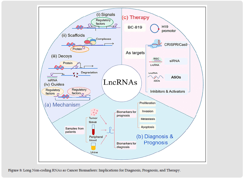 These molecules meet most of the required criteria for being an ideal biomarker, such as accessibility, high specificity, and sensitivity. Longnoncoding RNA (lncRNAs) are the RNA transcript that do not encode for proteins and do not have open reading frame (Figure 8). Long noncoding RNAs (lncRNAs) are major components of cellular transcripts that are arising as important players in various biological pathways. Due to their specific expression and functional diversity in a variety of cancers, lncRNAs have promising applications in cancer diagnosis, prognosis and therapy and have the potential to become biomarkers in cancers. LncRNAs can be noninvasively extracted from body fluids, tissues and cells, and can be used as independent or auxiliary biomarkers to improve the accuracy of cancer diagnosis or prognosis. Currently, the most well recognized lncRNA is PCA3, which has been approved for use in the diagnosis of prostate cancer. As biomarkers for cancer diagnosis and prognosis, lncRNAs can be extracted from tumor tissues, peripheral blood and urine samples of patients. In prognosis, they are correlated to patient’s proliferation, metastasis, invasion or survival. A distinctive feature of lncRNAs is their high specificity in tumor tissues and cells, making it possible for them to be specific and accurate biomarkers. Compared to protein based antitumor drugs, lncRNA are more refined and less toxic, and the low expression of lncRNA means that only a small amount of inhibitors are needed to make a difference.