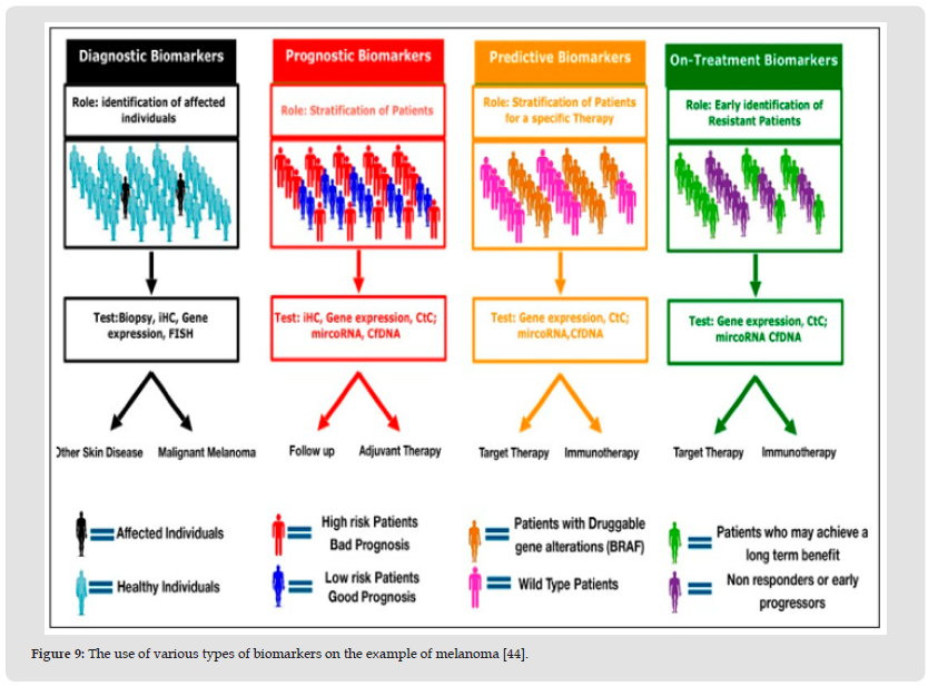 Besides, computational tools provide new opportunities for lncRNA biomarker development and stimulate lncRNA based cancer applications towards upgraded cancer drug discovery and drugs targeting lncRNAs with useful clinical insights. Biomarkers for personalized oncology are used mainly in molecular diagnostics of chronic myeloid leukemia, colon, breast and lung cancer, and recently in melanoma. They are successfully used in the evaluation of the benefits that can be achieved through targeted therapy or in the evaluation of toxic effects of the chemotherapeutic used in the therapy [24,25] (Figure 9). Due to the individualization of cancer therapy, the identification of cancer and oncology specific biomarkers has become a foremost goal for cancer researchers [26,10]. The common usage of PSA in prostate cancer screening has prompted investigators to look for appropriate biomarkers for screening other kinds of cancer. Targeted medicines, such as Iressa® (gefitinib), Gleevec® (imatinib), and Herceptin® (trastuzumab), are currently available and may benefit from a more targeted treatment based on diagnostic testing. Clinically, cancer related families of biomarkers may help identify individuals who are most likely to react to a medication, enable real time monitoring of treatment effectiveness, or detect early indications of drug toxicity. Furthermore, biomarkers are heavily used in go/nogo decision making throughout the drug development cycle, from early discovery to preclinical assessment. And thus development of oncologic therapies has traditionally been performed in a sequence of clinical trials intended to assess safety, preliminary efficacy, and improvement over the standard of care in homogeneous (in terms of tumor type and disease stage) patient populations.