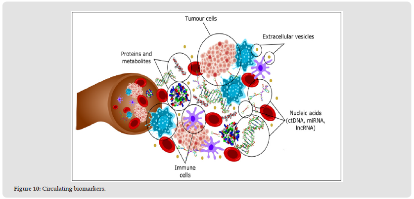 Apart from the FDA approved biomarkers, there are various new approaches utilized towards personalized targeted therapy to bridge the gap between disease diagnosis and its clinical manifestation. And with the emergence of more sensitive and specific technologies that are now able to be run in clinical settings and the ability to accurately measure biomarkers, there is a need to understand how biomarkers are defined, and how they are used in conjunction with drug treatment or with the frame of protocols of clinical trials [27]. In this context, for instance, NGS driven understanding of genes and their role in health and disease along with the increased testing capabilities have expanded the use of biomarkers across the research and care continuum. Biomarkers based on measurable levels of circulating markers in blood, plasma, and serum, as well as those identifiable on imaging, have been used for decades (Figure 10). Circulating biomarkers provide numerous advantages in practice and could inform the clinician by aiding in diagnosis, directing treatment, and predicting outcomes. Circulating biomarkers have emerged as valuable surrogates for evaluating disease states in solid malignancies. Their relative ease of access and rapid turnover has bolstered clinical applications in monitoring treatment efficacy and cancer progression. The analysis of circulating tumor DNA (ctDNA), tumor derived cells (CTC, circulating tumor cells) or circulating microRNA (miRNA) in blood and other body fluids, have a great potential to improve different aspects of cancer management. The challenge now is to find which types of components, biofluids and detection methods would be the most suitable to be applied in the different steps of precancer and cancer detection and treatment. Circulating biomarkers such as nonspecific markers of disease burden and tumor markers have been used in the clinical setting to aid treatment monitoring.