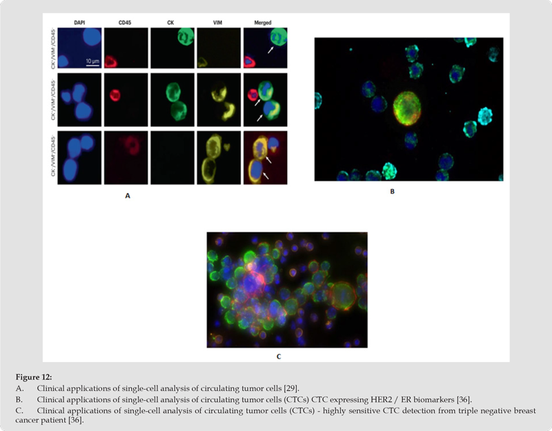 CTCs as a kind of cellular biomarker that is detected in patients with early stage cancers and, owing to their association with metastasis, might indicate the presence of aggressive disease, thus providing a possible means to expedite diagnosis and treatment initiation for such patients while avoiding overdiagnosis and overtreatment of those with slow growing, indolent tumors. It is estimated that more than 90% of cancer mortality is caused by distant metastasis. Investigating CTCs provides important tumor information since these cells are already related to metastatic disease; broken free from the tumor mass, transited through interstitial tissues, and intravasated into the vasculature. Understanding and counteracting this process is essential to managing cancer. The utility of CTCs as an early diagnostic tool has been investigated and confirmed (Figures 12A-12C).