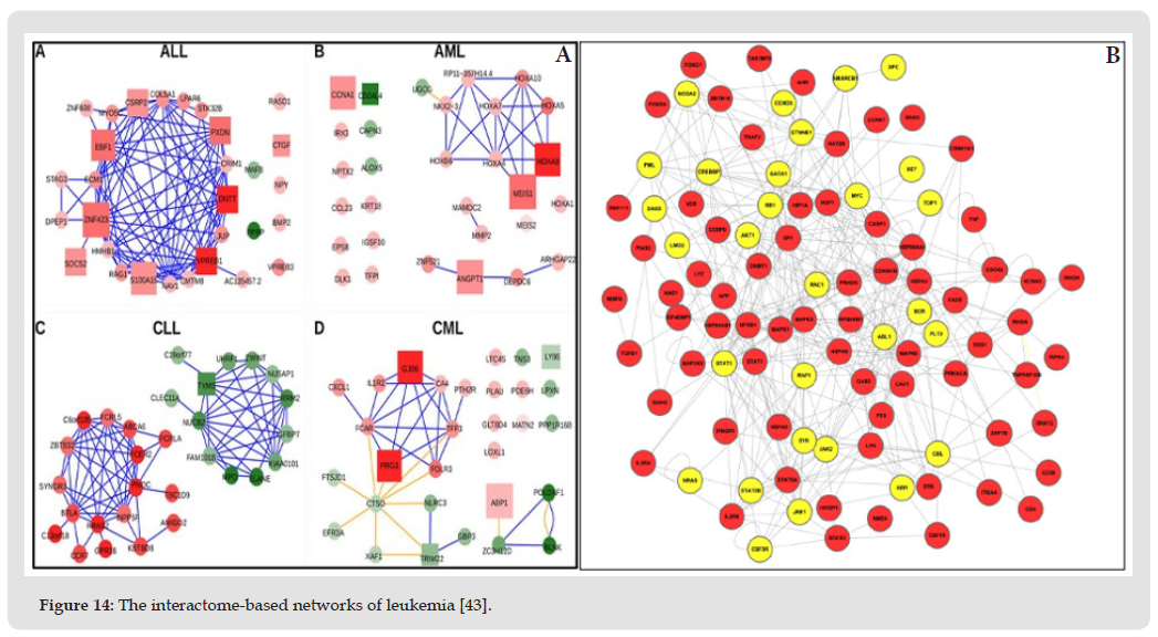 Moreover, following the clinical aims and objectives of the next step generation and having a complete understanding of a drug’s pathway, interactome, and network interactions could expedite the identification of sensitizing mutations, drug interactions, or the risks of drug combinations to guide biomarker discovery, including simple, combinatorial, and network-based biomarkers (NBBs). Today the experts may also identify specific pathways and interactome-based networks involved in diseases for which drugs have not yet been explored in appropriately designed trials, and being set up for: normal (physiological) and pathological conditions (Figures 14A & 14B). Great efforts have been undertaken in search of diagnostic biomarkers of leukemia. But individual molecules are not necessarily sensitive diagnostic indicators. Network biomarkers (NBBs) are considered to outperform individual molecules in disease characterization. The final network was further integrated with gene expression profiles to identify active modules with leukemia relevance. And the candidate NBB was evaluated for the diagnosing performance. A network of 97 genes and 400 interactions was identified for accurate diagnosis of leukemia. Functional enrichment analysis revealed that the network biomarkers were enriched in pathways in cancer. The NBBs could discriminate leukemia samples from the normal controls more effectively than the known biomarkers. The NBBs provide a useful tool to diagnose leukemia and also aids in further understanding the molecular basis of leukemia.