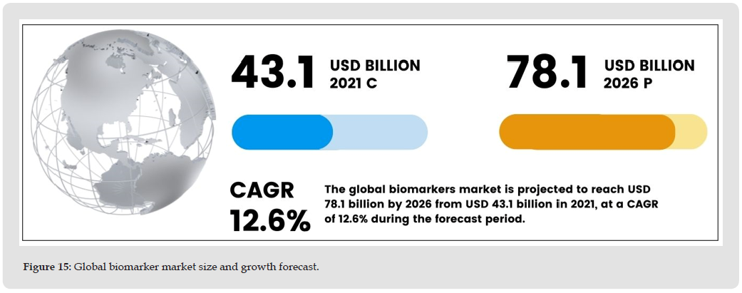 Biomarkers have gained significant scientific and clinical importance in the realm of PPM and related fields, offering potential benefits throughout the disease process. The oncology segment is the largest area for biomarker growth. Biomarkers can be used for early detection, estimate prognosis, guide selection of targeted therapies (companion diagnostics), and monitor response to treatment [40-43]. The increased demand for rapid and accurate diagnostic OMICS-tools, an increase in the global cancer burden, and an unmet need for more specific, personalized, therapeutic targets for cancer patients and precancer personsatrisk will continue to drive growth in the market, which is really growing. The current value of the global biomarkers market is estimated to be USD 43.1 billion, with an expected compound annual growth rate (CAGR) of 12.6% from 2021 to 2026 (Figure 15). The diagnostics segment of the global biomarker market is estimated to register the fastest CAGR over the forecast period [44- 47]. The predicted growth is owed to advances in early diagnosis and improvement in the rate of the diagnosis From: Biomarkers Market, available at marketsandmarkets.com