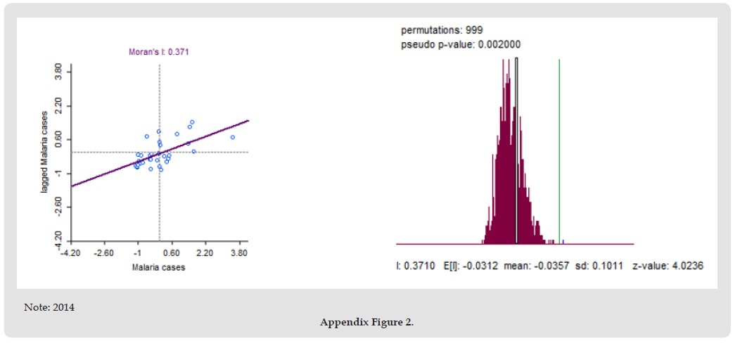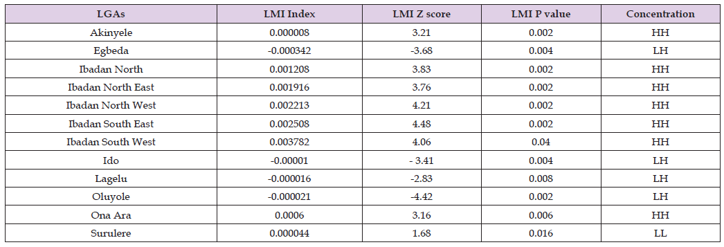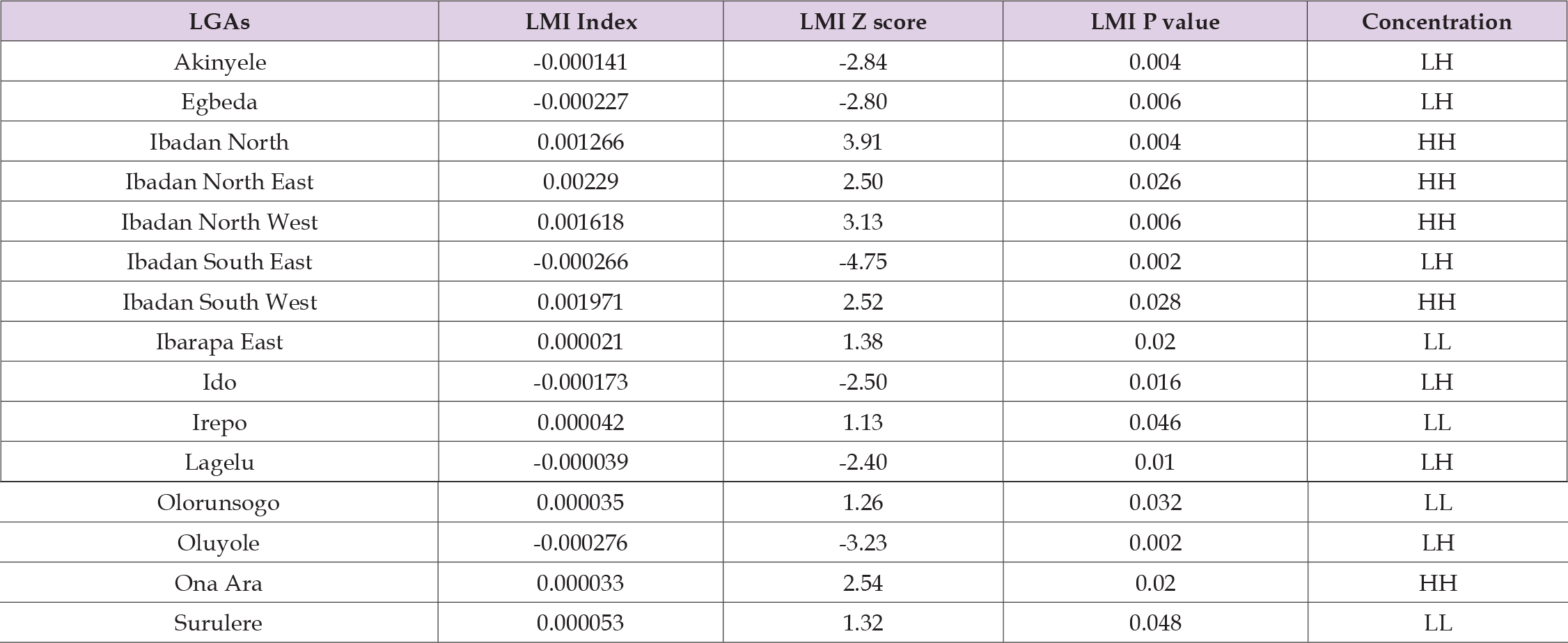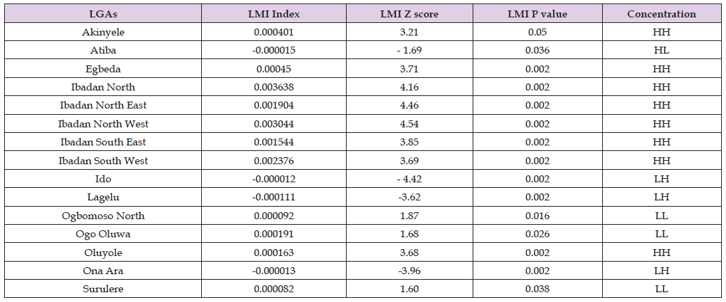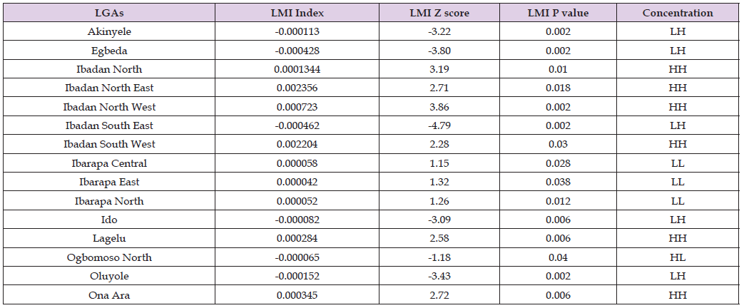 Table 6 below shows that Akinyele, Ibadan North, Ibadan North East, Ibadan North West, Ibadan South East, Ibadan South West, and Ona Ara have significant High High concentrations of malaria incidence at the 5% threshold. Low to high clustering of malaria incidence in these locations is indicated by the Low High concentration of malaria incidence observed in LGAs such Lagelu, Ido, Oluyole, and Egbeda. There is a strong likelihood that LGAs with high-high and low-high concentrations of malaria incidence will impact their neighbors with low-low or no clustering. Surulere exhibits a very low concentration of malaria incidence. Since P values < 0.05 level of significance, the null hypothesis of randomness is therefore rejected and it is concluded that spatial pattern is clustered, which further depicts strong spatial dependence across study area in year 2014. The geographic visual representation of the local Moran I is displayed in Figure 6.