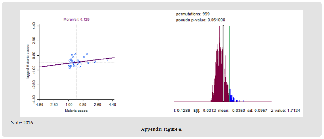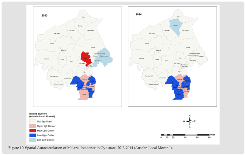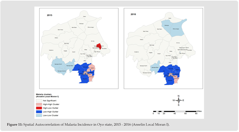 Table 8 below shows that at the 5% level, Ibadan North, Ibadan North East, Ibadan North West, Ibadan South West, and Ona Ara have a statistically significant High High concentration of malaria incidence. The low to high clustering of malaria incidence in these locations is indicated by the Low High concentration of malaria incidence observed in LGAs such Akinyele, Egbeda, Ibadan South East, Ido, Lagelu, and Oluyole. There is a strong likelihood that LGAs with highhigh and low-high concentrations of malaria incidence will impact their neighbors with low-low or no clustering. Ibarapa East, Irepo, Olorunsogo, and Surulere exhibit a very low concentration of malaria incidence. Since P values < 0.05 level of significance, the null hypothesis of randomness is therefore rejected and it is concluded that spatial pattern is clustered, which further depicts strong spatial dependence across study area in year 2016. The geographic visual representation of the local Moran I is displayed in Figures 7-11.