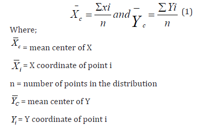 The mean is a critical measure of central tendency for a set of data. When the concept of central tendency is applied to locational point data in two dimensions (X and Y coordinates), the mean center, sometimes referred to as the average location, can be found. It can be found by separately averaging the X and Y coordinates, as follows: