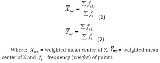 The simple (unweighted) Euclidean median is logically expanded to become a weighted Euclidean median. Population, sales volume, or any other feature suited to the spatial problem may be represented by the weights or frequencies. The weighted Euclidean median’s we we Xwe Ywe coordinates will minimize the expression.