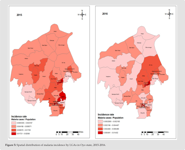 Figure 2 below clearly depicts the map displaying the incidence rate of malaria in the years 2015 and 2016. Less cases of malaria were reported in 2016 compared to 2015 in LGAs such Irepo, Oluyole, Orelope, Kajola, Itesiwaju, Olorunsogo, Atisbo, Iwajowa, Iseyin, Afijio, Ido, Akinyele, and Lagelu. Atiba and Ori Ire saw an increase in malaria cases, whilst Saki West, Saki East, Ogbomoso North, and Surulere LGAs saw no improvement. Due to the fact that there were fewer malaria cases reported in 2016, there was an improvement from 2015 to 2016. Figure 3 below makes it evident that from 2013 to 2016, Oyo South reported the largest number of malaria cases, while Oyo North recorded the lowest. Four LGAs (Ibarapa East, Ibadan North, Ibadan North East, and Ibadan South West) out of the nine LGAs in Oyo South contributed more than 50% of the total malaria cases reported in that region from 2013 to 2016.