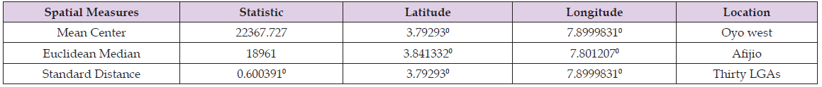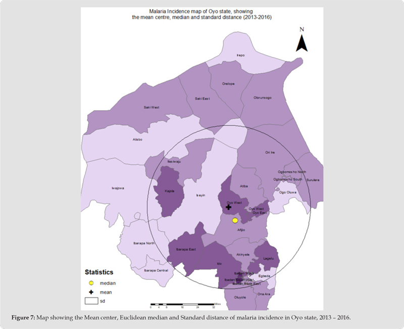 Table 2 below shows the malaria incidence mean center, Euclidean median, and standard deviation. The mean center and euclidean median are represented by the latitude and longitude 3.792930 and 3.8413320 and 7.89998310 and 7.8012070, respectively. This implies that the malaria incidence centers in Oyo State are concentrated in the LGAs of Oyo West and Afijio. Additionally, latitude 3.792930 and longitude 7.89998310 are the locations of a standard distance of 0.6003910. The standard distance deviation shows that the spread of malaria incidence from Oyo West LGA also covers areas such as Akinyele, Atiba, Afijio, Saki East, Ori Ire, Olorunsogo, Surelere, Atisbo, Iwajowa, Kajola, Iseyin, Itesiwaju, Ogbomoso North, Ogbomoso South, Ibarapa North, Ibarapa Central, Ibarapa East, Ido, Ibadan North, Ibadan North East, Ibadan South East, Ibadan South West, Ibadan North West, Oyo West, Oyo East, Lagelu, Egbeda, Oluyole, Ona Ara and Ogo Oluwa.