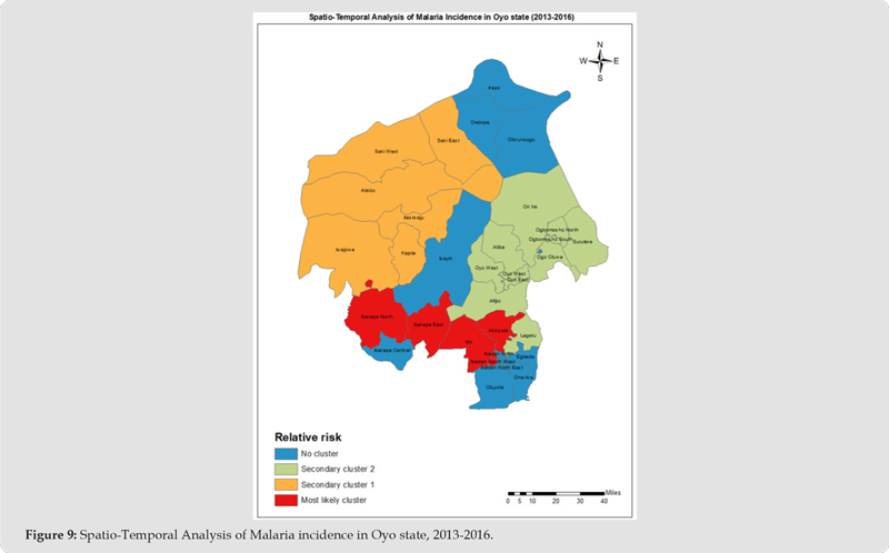 Table 3 below makes it evident that four significant malaria clusters were identified at the 5% level. Ido, Akinyele, Ibadan South West, Ibadan North –West, Ibadan North, and Ibarapa East LGAs have the most probable cluster (RR = 1.55). Oyo West and Oyo East LGA are home to the first secondary cluster (RR = 1.43). Lagelu LGA is home to the second secondary cluster (RR = 1.33), and Kajola is home to the third secondary cluster (RR = 1.12). As a result, the null hypothesis is rejected at the 5% significance level, and it is determined that there is enough data to draw the conclusion that malaria clusters are significant everywhere. Figures 4 & 5.