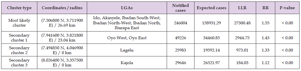 Table 4 below makes it evident that three substantial malaria clusters were identified at the 5% level. Between January 2013 and December 2014, the Ido, Akinyele, Ibadan South West, Ibadan North –West, Ibadan North, and Ibarapa East LGAs had the highest probability of clustering (RR = 2.27). The Oyo south region is mostly home to the most likely cluster. The first secondary cluster was discovered between January 2013 and December 2014 at Atisbo, Saki West, Saki East, kajola, Itesiwaju, and Iwajowa (RR = 1.75). The second secondary cluster was discovered between January 2013 and December 2014 at Ogo Oluwa, Ogbomoso South, Ogbomoso North, Atiba, Oyo East, Oyo West, Surulere, Ori Iri, Afijio, and Lagelu LGA (RR = 1.48). Hence, the null hypothesis is rejected at 5% level of significance and it is concluded there is sufficient evidence that malaria cluster are significant across the geographical locations and time periods.