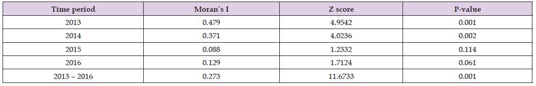 Table 9 below displays the 2013 Moran I index calculation result, which is 0.479. The Z score is 4.95 standard deviations, and the p value is 0.001. According to this result, there is a less than 5% chance that the clustered pattern is not a coincidental coincidence. For 2014, the calculated value of the Moran I index is 0.371. The Z score is 4.02 standard deviations, and the p value is 0.002. According to this result, there is a less than 5% chance that the clustered pattern is not a coincidental coincidence. The outcome of the 2015 Moran I index computation was 0.088. The Z score is 1.23 standard deviations, and the p value is 0.114. This result implies that the likelihood that the clustered pattern is a random chance is more than 5%. The outcome of the 2016 Moran I index computation was 0.129. The Z score is 1.71 standard deviations, and the p value is 0.061. This conclusion implies that the likelihood that the clustered pattern is the product of chance is larger than 5%. From 2013 to 2016, the computed value of the Moran I index is 0.273. The Z score is 11.67 standard deviations, and the p value is 0.001. According to this result, there is a less than 5% chance that the clustered pattern is not a coincidental coincidence (Appendix Figures 1-5).