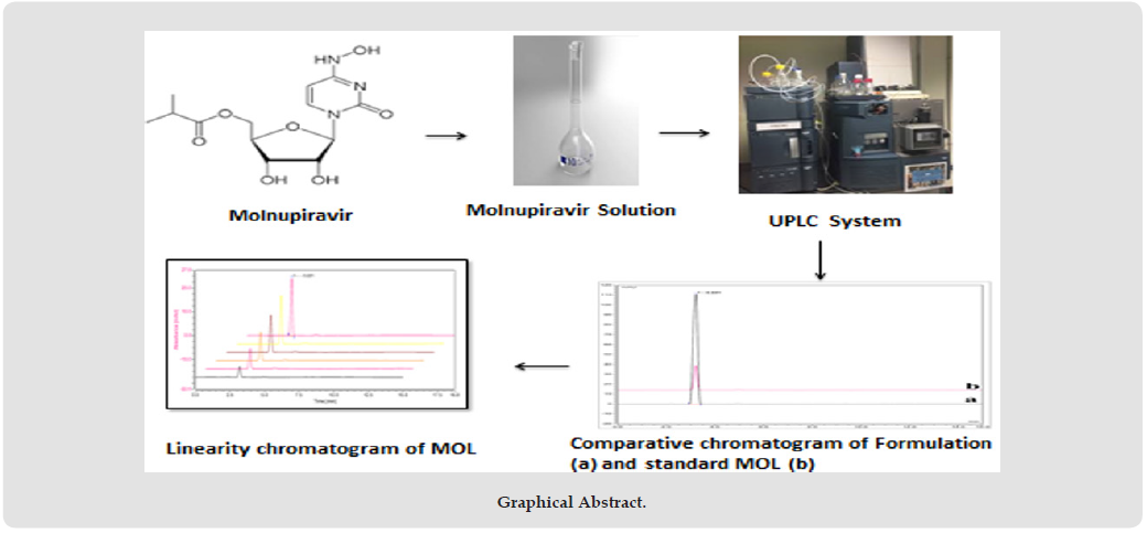 Merck and Ridgeback Biotherapeutics created Molnupiravir (MK- 4482 or EIDD-2801), an oral antiviral medication, to treat COVID-19. Molnupiravir (MOL) suppresses the reproduction (replication) of RNA viruses. MOL is a prodrug (Activated after its metabolism) incorporated into the RNA of the virus, causing modifications that render the virus incapable of reproduction. The clinical trials of MOL show promising results against COVID-19. The MOL was widely utilized to treat COVID-19 and related viruses. The success of pharmaceutical formulations and clinical trials relies on accurate and precise monitoring of MOL levels in the formulation and biological samples. Therefore, developing a reliable and robust analytical method for measuring MOL is essential for determining the formulation or biological samples. Ultrahigh-Performance Liquid Chromatography (UPLC) is well-suited for routine analysis to determine small molecules like MOL [1-4].
