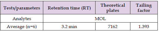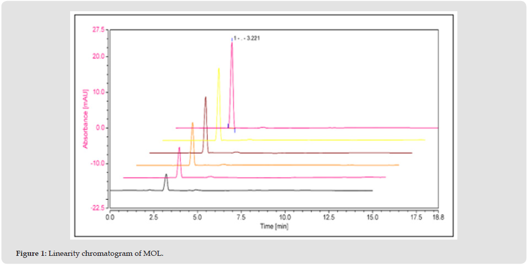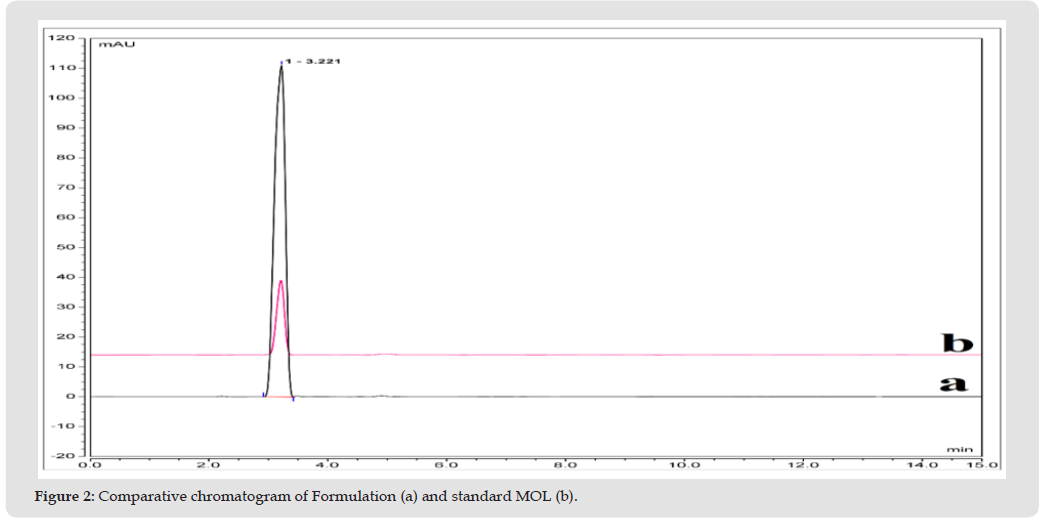we selected a mobile phase consisting of methanol and 0.2% OPA in water at a ratio of 85:15 (v/v), 10μL sample size with a flow rate of 0.8 ml/min. Our samples were analyzed at 240 nm, and we observed a sharp and symmetrical peak at the RT of 3.2 min for MOL.