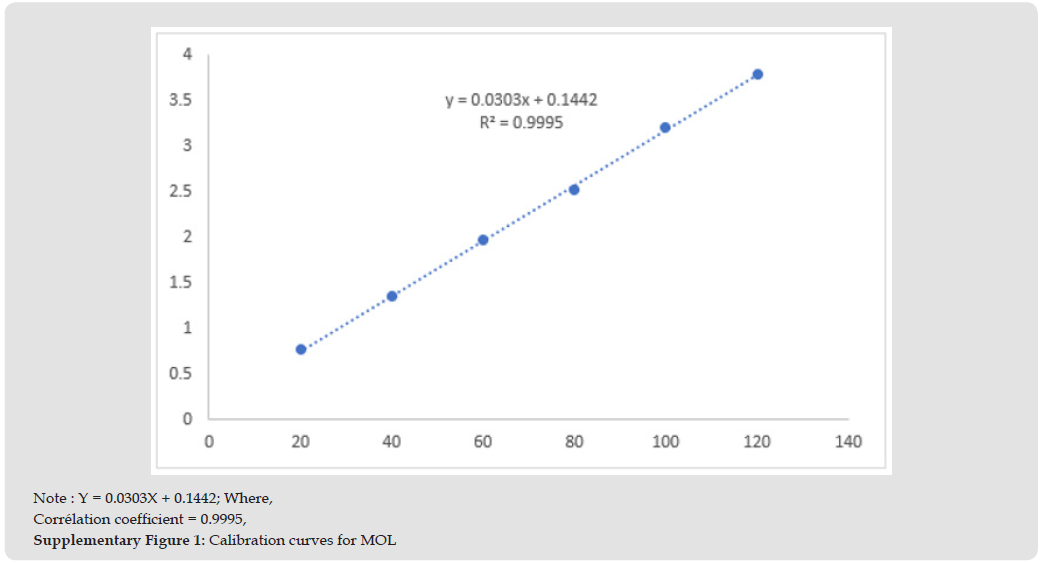 The standard stock solution of MOL was prepared by dissolving 100 mg of in 100 mL methanol to give a concentration of 1 mg/ ml. Further calibration levels (20 μg/ml,40 μg/ml,60 μg/ml,80 μg/ ml,100 μg/ml and 120 μg/ml) were prepared by diluting the standard stock solution with methanol to obtain appropriate concentrations. Standard solutions were stored at 4 °C.