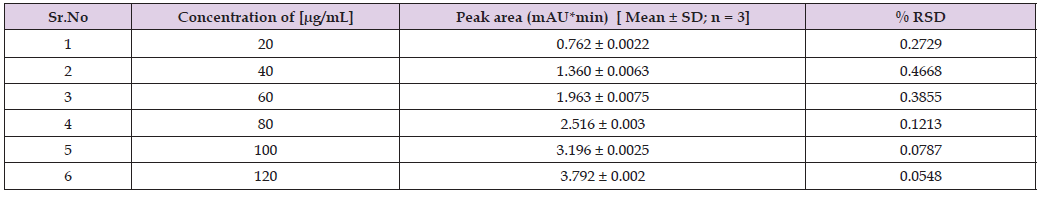 The precision of the analytical method was assessed by determining its intraday and interday variations. Intraday precision, also known as repeatability, was evaluated by analyzing duplicate injections of the standard solution’s low, medium, and high concentrations on the same day under identical experimental conditions. Interday precision was determined by analyzing the same concentrations of the standard solution for three days (Table 3). These values indicate that the method has good precision and is suitable for quantification of the analyte (Supplementary Table 3). The results of repeatability studies are mentioned in Table 4.