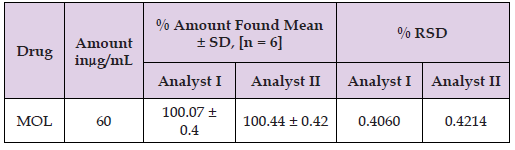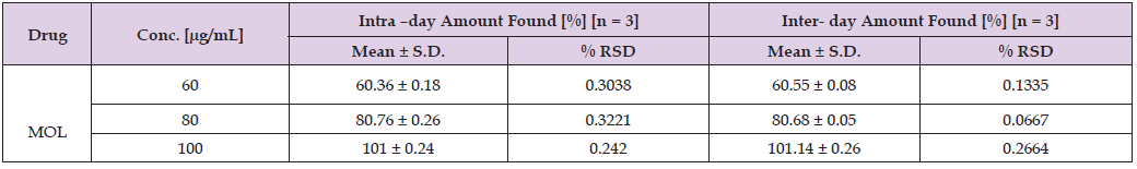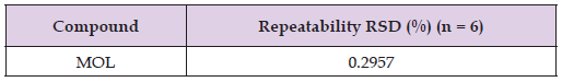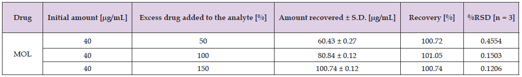 To determine the accuracy of the analytical method, the closeness of the obtained test results to the true value was evaluated based on the recovery of known amounts of the analyte. It was done by recovery study using standard addition method at 50%, 100% and 150 % level; To perform the analytical recovery, a standard solution of 40 μg/mL of the analyte was spiked into a standard solution of MOL on three different days. The resulting solutions were analyzed using the developed analytical method (Supplementary Table 2).