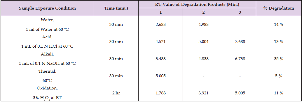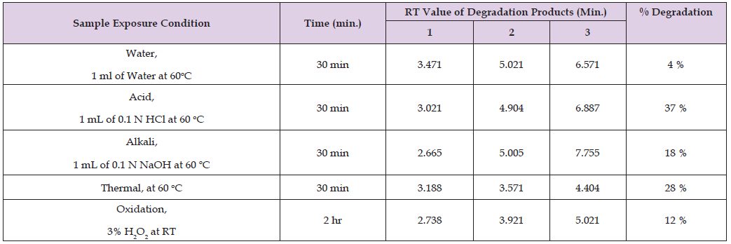 Specificity and Selectivity: The specificity of the developed UPLC method was ensured by studying at blank non-interference and comparing the retention time of target analyte peaks from the sample analyst to the reference standard. No difference was found in the peaks and spectra of reference standards and the sample analyzed. The peak purity tool was used to evaluate the peak purity of the samples. Hence the developed method demonstrates specificity and selectivity. Force Degradation Studies: The specificity of the approach can be demonstrated by subjecting a sample to acid, alkaline, oxidative, thermal, photolytic, degradation. After subjecting the sample to these circumstances, analyzing the primary peak for peak purity indicates that the approach successfully separates the degradation products from the pure active component. (“ICH, Q1A (R2) stability testing of new drug substances and products,” 1996)