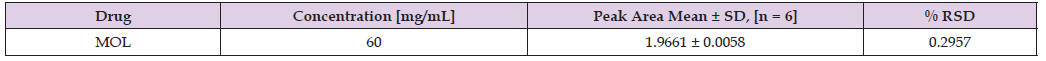 System Suitability: The primary objective of system appropriateness assessment is to mitigate the potential adverse effects that may result from the perceived instability of chromatographic elements, such as the pump, detector, or column type, on official procedures. A solution containing 20 μg/mL of MOL was injected and analyzed in six replicates. The values for Retention Time (RT), peak area, theoretical plate number, tailing factor, resolution, and Relative Standard Deviation (percent RSD) were estimated.