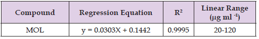 Linearity: Analyses of standard solutions of MOL at concentrations ranging from 20 μg/ml to 120 ug/ml were utilized to evaluate the linearity of the developed UPLC. Calibration curves were generated by mapping the peak regions/areas against the relevant concentrations of the analytes. The linearity of the method was measured by calculating the correlation coefficient (R2) and the slope of the calibration curve. The analytes had R2 values that were higher than 0.99, which meant that there was a good linear relationship between the peak area and the concentration of the analytes.