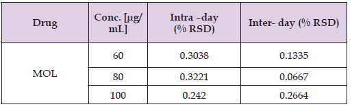To determine the method’s precision, on three separate days, six replicate injections of three different concentrations of MOL were analyzed to determine the accuracy of the developed UPLC method. The accuracy was studied by determining the analyte peak regions’ Relative Standard Deviation (RSD). Intra-day precision was evaluated by analyzing six replicate injections of the same sample on the same day, while inter-day precision was determined by examining six replicate injections of the same sample on three separate days. The results showed RSD values of less than 2%, indicating good precision of the developed method. Values with % RSD ≤ 2% for peak area responses were accepted.