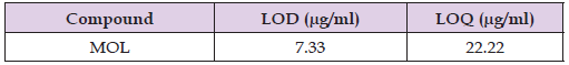 Sensitivity (Limit of Detection and Limit of Quantification): The Limit of Detection (LOD) and Limit of Quantification (LOQ) of the developed UPLC method were obtained by evaluating standard solutions of MOL at low concentrations until the signal-to-noise ratio (S/N) was determined to be 3:1 and 10:1, respectively. As per the ICH guidelines, the limits of detection and quantification of the developed method were calculated from the standard deviation of the response and slope of the calibration curve of markers using the following formulas: