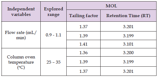 The robustness of the proposed investigation was assessed by employing a 30 μg/mL concentration. The impact of varying the flow rate of the solvent system (0.9-1.1 mL/min), temperature of the column oven (25-35 oC), and wavelength on the theoretical plates, tailing factor and RT of MOL was explored. It was noted that the introduction of minor yet intentional fluctuations to the selected independent variable did not yield any significant impacts on the responses. Therefore, it can be inferred that the proposed investigation was robust when minor yet purposeful adjustments were made to the chromatographic conditions. Findings are presented in Table 7.