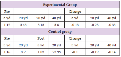 Table 2: Paired t-tests for linear speed differences within the EG and within the CG at 5, 20, and 40-yards.
