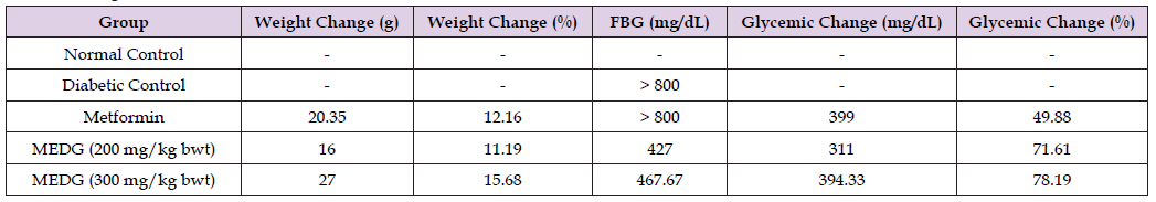 Wistar albino rats with MEDG stem bark markedly reduced the FBG concentration and body weights of rats