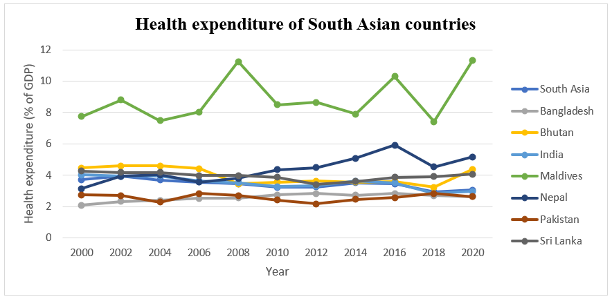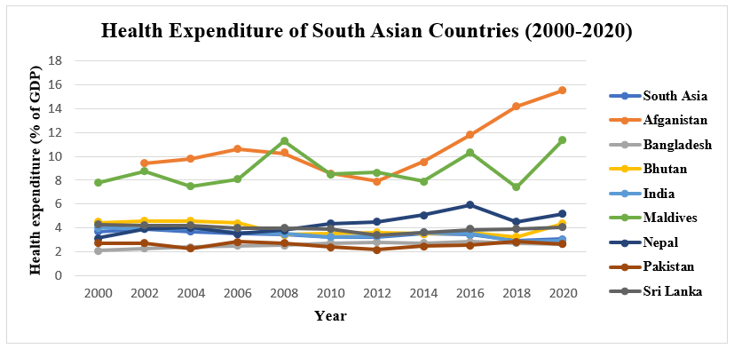 Figure 1: Comparative Analysis of Healthcare Expenditure in South Asian Countries as a Percentage of GDP (2000 - 2020).