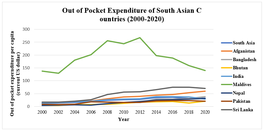 Healthcare services play a pivotal role in the development and wellbeing of societies, with investments in their accessibility and quality directly fueling economic growth. In this context, the South Asian region presents a complex scenario (Figure 1). The Figure 2 illuminates the disparity in health investment across the South Asian countries over the past two decades. Among the South Asian countries, Afghanistan and the Maldives were observed with greater and increasing expenditure of GDP for health. Other countries of this region were observed with a little change in health expenditure for last 20 years. Due to rapid urbanization, lifestyle habits have undergone significant changes over the last few decades, resulting in a tremendous increase in non-communicable diseases (NCDs) such as diabetes mellitus, hypertension, and other conditions that pose significant risk factors for various NCDs, including obesity, sedentary lifestyles, the consumption of junk food, and excessive screen time. To cope with the growing population and increasing healthcare demand, it is essential to address the existing challenges. Strengthening healthcare delivery and ensuring universal and accessible healthcare for all will foster overall national growth. Additionally, it is crucial to address emerging health challenges. This includes addressing healthcare infrastructure gaps, strengthening healthcare delivery, tackling emerging health challenges, reducing out-of-pocket expenditure, promoting economic productivity, and achieving universal health coverage. Such investments are crucial for the well-being and future prosperity of the nations and their populations. One of another significant barriers to healthcare in South Asia is the high out-of-pocket expenses which include consultation fees, medication costs, and transportation expenses [42].