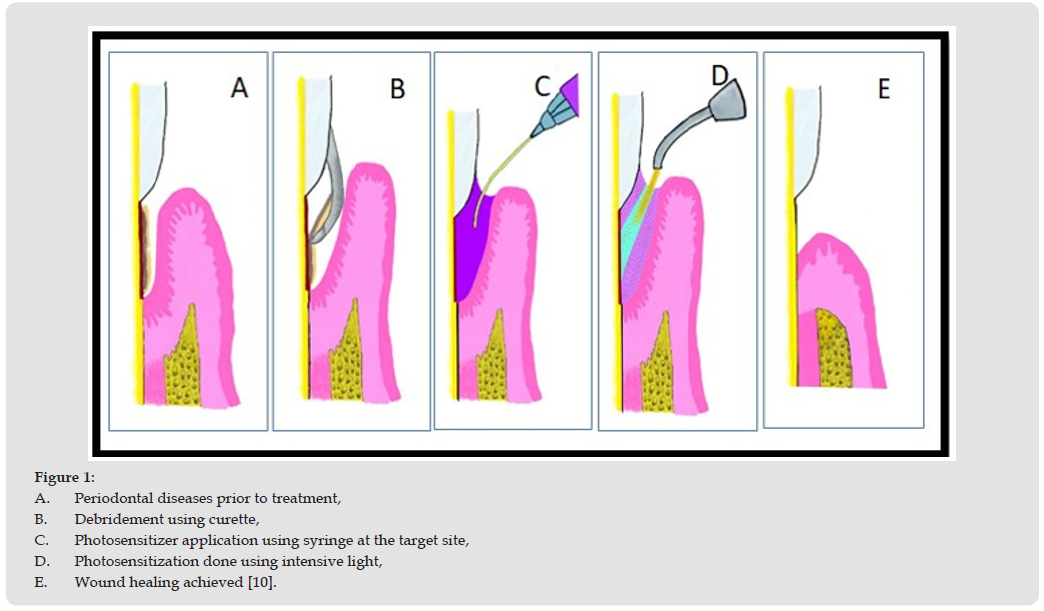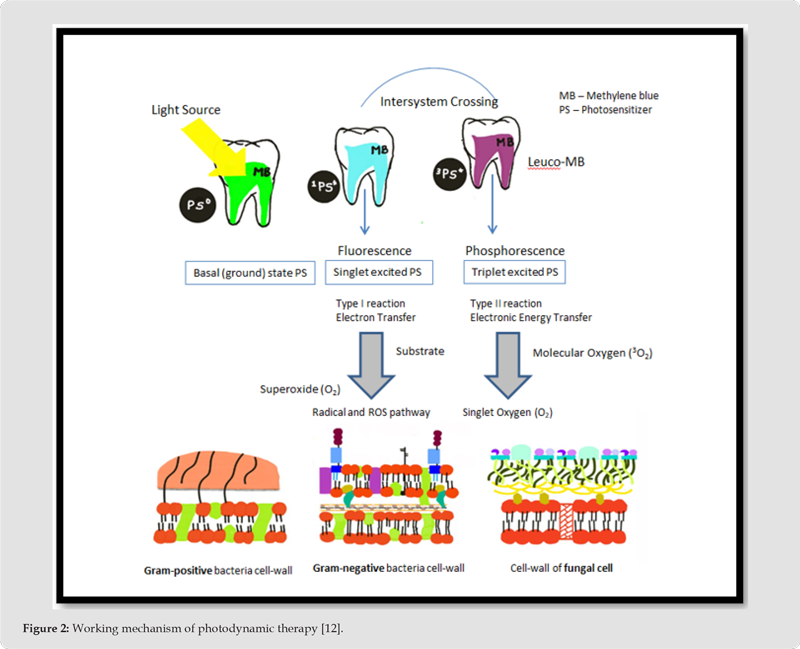 The most commonly used lasers are diode, erbium lasers, CO2 lasers because of their haemostatic properties, bactericidal effects and selective calculus ablation [7]. In today’s rapidly growing technological world, the application of photodynamic therapy (PDT) as a means of antimicrobial treatment has become increasingly important. The increase in PDT as an alternative approach to treating a variety of periodontal infections is due to the sudden increase in the number of antibiotic-resistant microorganisms. These organisms living in biofilms are up to 1,000 times more resistant to antimicrobials [8]. Photodynamic therapy is a non-invasive therapeutic treatment used to treat a variety of infections caused by bacteria, fungi and viruses. PDT has been defined as “an oxygen dependent reaction that occurs by action of low energy single frequency light and activation of photoactive materials/photosensitizers” [9]. Photodynamic therapy involves the use of a low-power diode laser in conjunction with photosensitization compounds (Figure 1) [7,10].