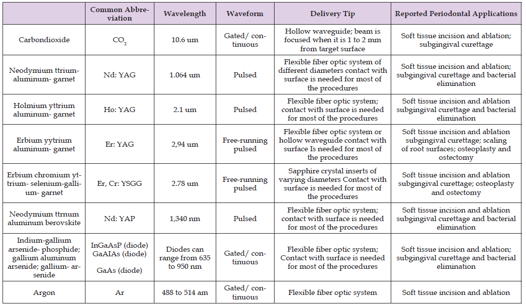 Consequently, alternative techniques for treating periimplantitis have been recommended as a more suitable solution [3]. Lasers can be used to disinfect implant surfaces and help treat the inflammatory process surrounding the implant in the presence of photosensitizers. This is known as photodynamic therapy. Lasers used in dentistry includes different types of wavelengths that are delivered in continuous, pulsed or continuous wavelengths. The table attached below gives a brief description about various lasers used in dentistry (Table 1) [6].