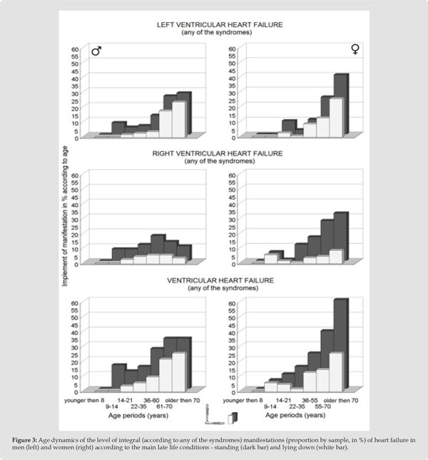 In Figure 2 shows data on the age-related dynamics of manifestation (proportion by sample, in %) of all four main circulatory syndromes of heart failure. With LHF, these were circulatory syndromes by perfusion (hemodynamically identified as syndromes of arterial insufficiency or hyper resistance of arterial vessels according to SC) and by stasis (hemodynamically identified as syndromes of venous insufficiency and stagnation by PC). With RHF, these were circulatory syndromes due to perfusion (hemodynamically identified as syndromes of arterial insufficiency or hyper resistance of arterial vessels according to PC) and stasis (hemodynamically identified as syndromes of venous insufficiency and stagnation according to SC). First of all, it should be noted that in all cases, and according to our sample it was 2% of women with a clinically diagnosed heart failure, the condition was also confirmed according to the data of the considered diagnostic algorithm. Since in clinical practice the concept of congestive heart failure was usually identified with congestive forms of the left and right ventricles of the heart, the correspondence of the data obtained by the proposed method of diagnosis with known data on the prevalence of congestive heart failure [2,15] indicates the diagnostic reliability of the proposed method. According to the summary data obtained for Europe, the prevalence of HF was 1,7%, in the USA - 2,4-3,0%, in the UK - 1,5-1,6% [25].