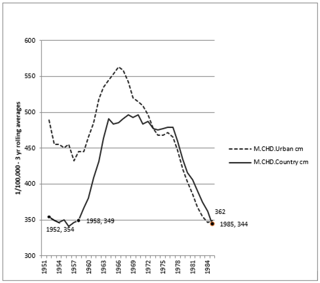 It seems plausible that the common CHD risk factors [7], cannot fully explain the low rural male CHD mortality [55] in 1951-57 (Fig.1), when people especially in the countryside consumed raw milk, with fat content 4.5-5 % [55], (before the era of statin medication).