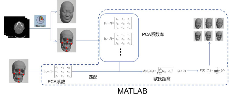 Based on the CT data of the skull in the study, the study was located to six anatomical feature points and matched the three closest skull in the database and their faces through the principal component coefficient distance of the feature points. The specific experimental flow is shown in the figure below.