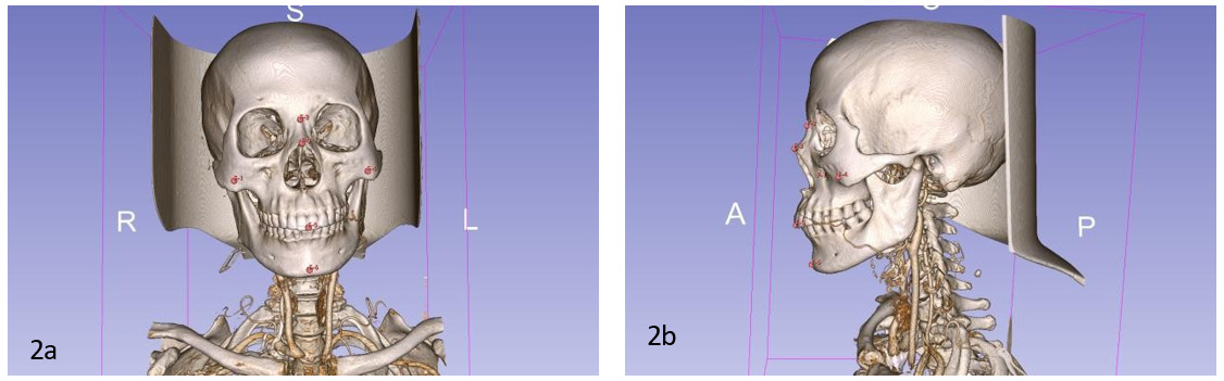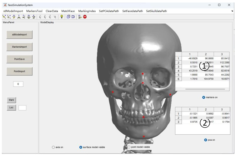 The data was volume rendered (Volume Rendering) in 3DSlicer, using Create new Point List to create a set of mark points, respectively in the left cheekbone, the nasal root, the end of the nasal bone, the right cheekbone, the maxillary middle incisor, and the mandibular mental process, to create a set of 6mark points (Figure 1). After positioning, the coordinates were copied in the Markups module and imported into Excel for numbering.