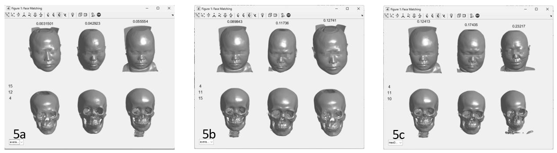 According to the first and second principal component characteristics in Table 2, the corresponding minimum 3 distances in all samples are selected, and the corresponding face and skull models are extracted through the mapping of the principal component digital feature library and displayed. In this case, the no. 4 skull model is verified, and Figure 4 shows the matching results. As Figure 3 illustrated, the similarity and distance order are 15 (0.00315), 12 (0.04292), 4 (0.05555), 4 (0.08984), 11 (0.1.11736), 15 (0.12741), and the maximum matching order is 4(0.12413), 11 (0.17435), 10 (0.23217). The skull model is considered to match successfully.