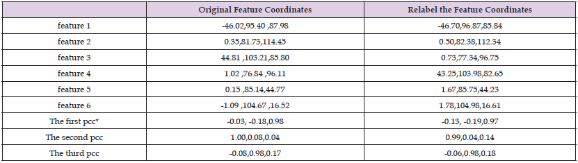 Table 1: Characteristic coordinates and principal components of the original features and re-labeled coefficients.