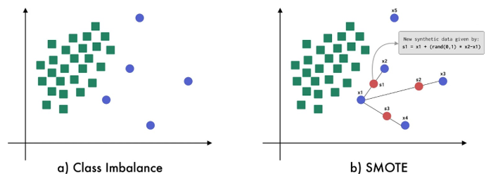 The Synthetic Minority Oversampling Technique (SMOTE) generates synthetic minority class examples in order to rectify class imbalance in datasets. In SMOTE, the minority class is oversampled by creating artificial examples that resemble real minority instances. Using line segments that connect randomly picked data points and their closest neighbors in the minority class, this strategy creates new data points along the feature space gap in an attempt to fill it. In order for SMOTE to function, each observation in the minority class must be iteratively chosen. Next, each observation’s k nearest neighbors must be determined, and synthetic observations must be created between the chosen data point and its neighbors. In order to establish the direction and distance for creating synthetic instances, the algorithm chooses neighbors at random. A percentage is given to indicate how much oversampling is necessary; larger percentages result in the creation of more synthetic instances. Figure 4 shows the Synthetic Minority Oversampling Technique (SMOTE) (Figure 4).