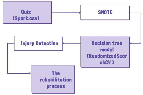 In this study, we used Decision Tree model where each class corresponds to a state injury to the athlete. The low ratio between the number of injuries and the number of observations available in the database, 182 sure injuries for 3722 observations, or 5.1% of the total number of observations, accounts for an im- balance between the two classes to predict. The fourth stage walks through the rehabilitation procedure. Additional details are in the following subsections.