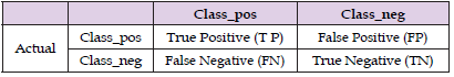 The suggested approach is compared and assessed using accuracy, precision, recall, F1-score, and area under the receiver operating characteristics (ROC) curve. In this study, we used macro and micro averages of recall, precision, and F1-Score. Multiple-class classification score. The confusion matrix (CM) can be used to create all the metrics stated above. Table 1 shows that while CM is built for binary classes, it can be extended to many more (Table 3). Table 3 shows the amount of classpos data that is predicted to actually be- long in classpos, the amount of classneg data that is predicted to actually belong in classneg, the amount of false positive (FP) data that is predicted to be class- neg but actually belongs in classpos, and the amount of false negative (TN) data that is predicted to be classneg but actually belongs in classpos. The evaluation metrics are computed using the terms mentioned above.