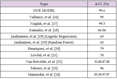 However, it wasn’t until recently that the available data set was examined using the appropriate statistical techniques. Thanks to machine learning’s advances in autonomous and interactive data analysis, the nuances of the relationship between player load and injury are now more known. Here, we contrast our method with that of a few other machine learning-focused works: (Vallance, et al. [16-24]). Table 5 presents a comparison between our best research on sports injuries and the research of other authors (Table 5). A comparison of the suggested Behavior sport-AI model’s accuracy with other benchmark models is shown in Figure 8, which indicates that Behavior Sport-AI is more accurate than the other models. In terms of accuracy, the proposed Behavior sport-AI model outperforms its comparable peers, with 99.60%. Table 5 presents an accurate comparison between the proposed model and existing literature models. In other cases, the results are summarized without providing details about the injuries discovered, and some of the models being compared don’t use cross-validation. Though more research is required to compare our findings with those of the literature, the overall result shows the value of utilizing Behavior sport-AI to detect injuries in the data set. By employing these methods, one can somewhat reduce the performance achieved while maintaining the outcomes with those of other similar studies.